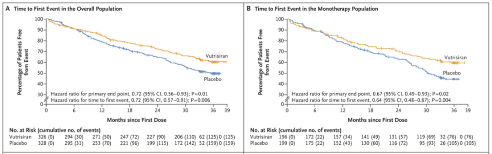 ▲Vutrisiran显著降低总体患者(左)与单药治疗患者(右)的全因死亡率和复发心血管事件的风险(图片来源:参考资料[2])